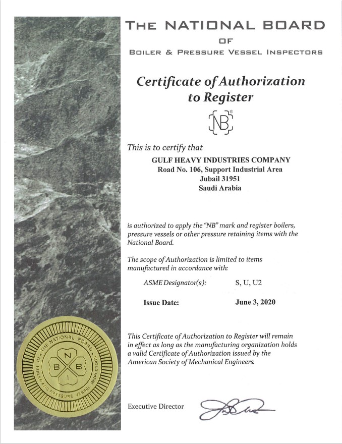 The National Board of Boilers & Pressure Vessel Inspectors Certificate of Authorization for applying the “NB” mark and register Boilers, Pressure Vessels or other Pressure retaining items