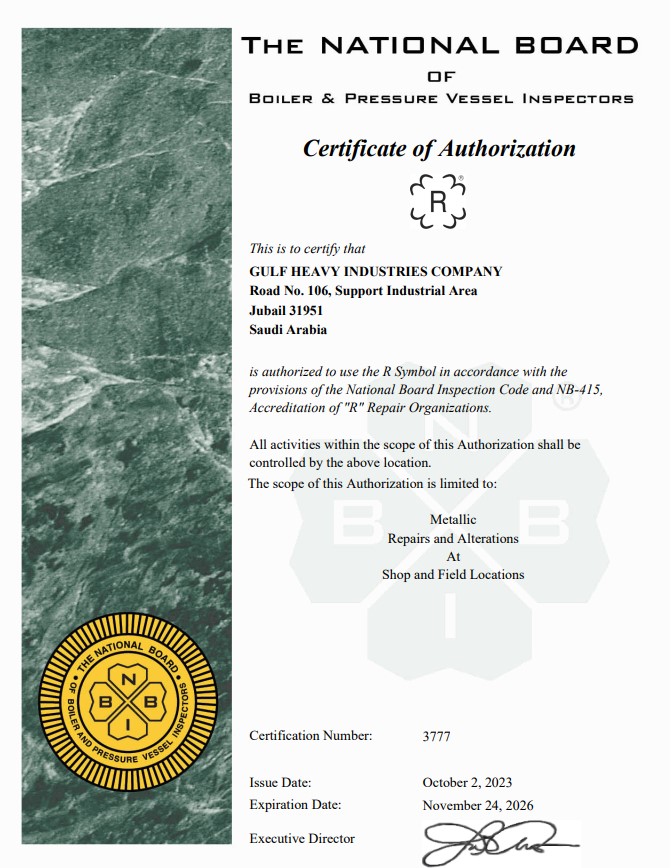 The National Board of Boilers & Pressure Vessel Inspectors Certificate of Authorization “R” Stamp for Repair / Alterations.